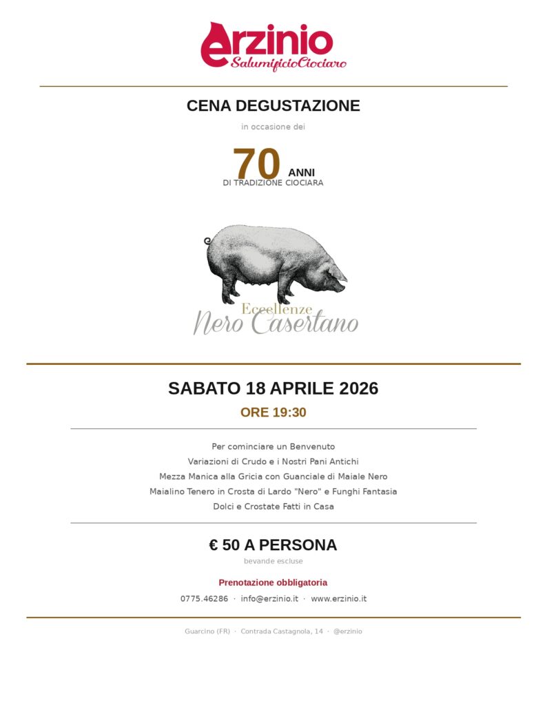con i prodotti di Nero Casertano, una delle razze più pregiate al mondo, per festeggiare i 70 anni di attività, lavorato dal Salumificio Erzinio e allevati ad Arpino in riserva naturale......per l 'occasione apriremo un Prosciutto con 70 Mesi di stagionatura dal peso di 22 Kg. Un Occasione unica per assaggiare queste eccellenze uniche al mondo.